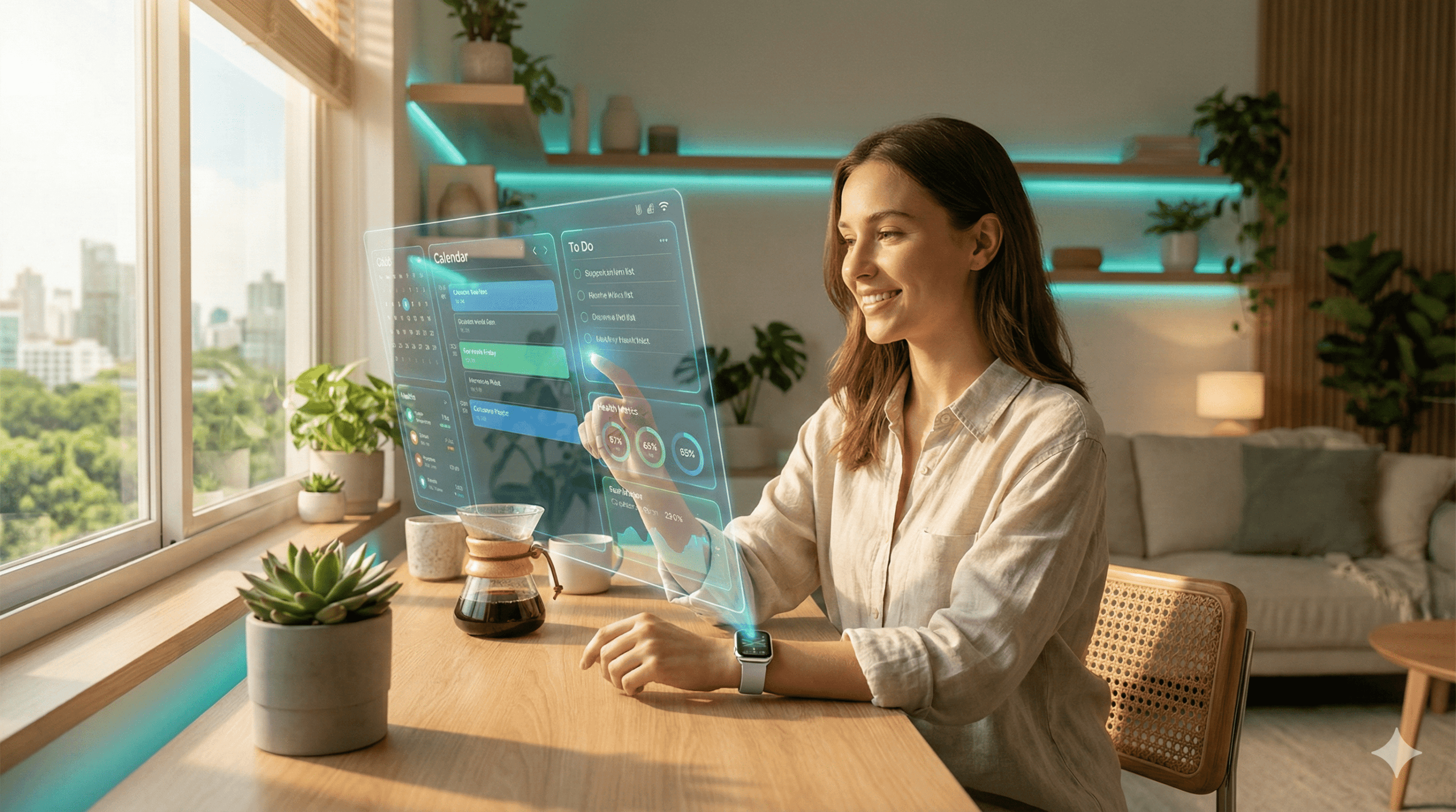 • الإضاءة السيركادية: إضاءة المنزل تتغير تدريجياً مع غروب الشمس لتصبح دافئة (برتقالية) لتحفيز هرمون النوم (الميلاتونين)، وتصبح زرقاء ساطعة صباحاً لتنشيطك.